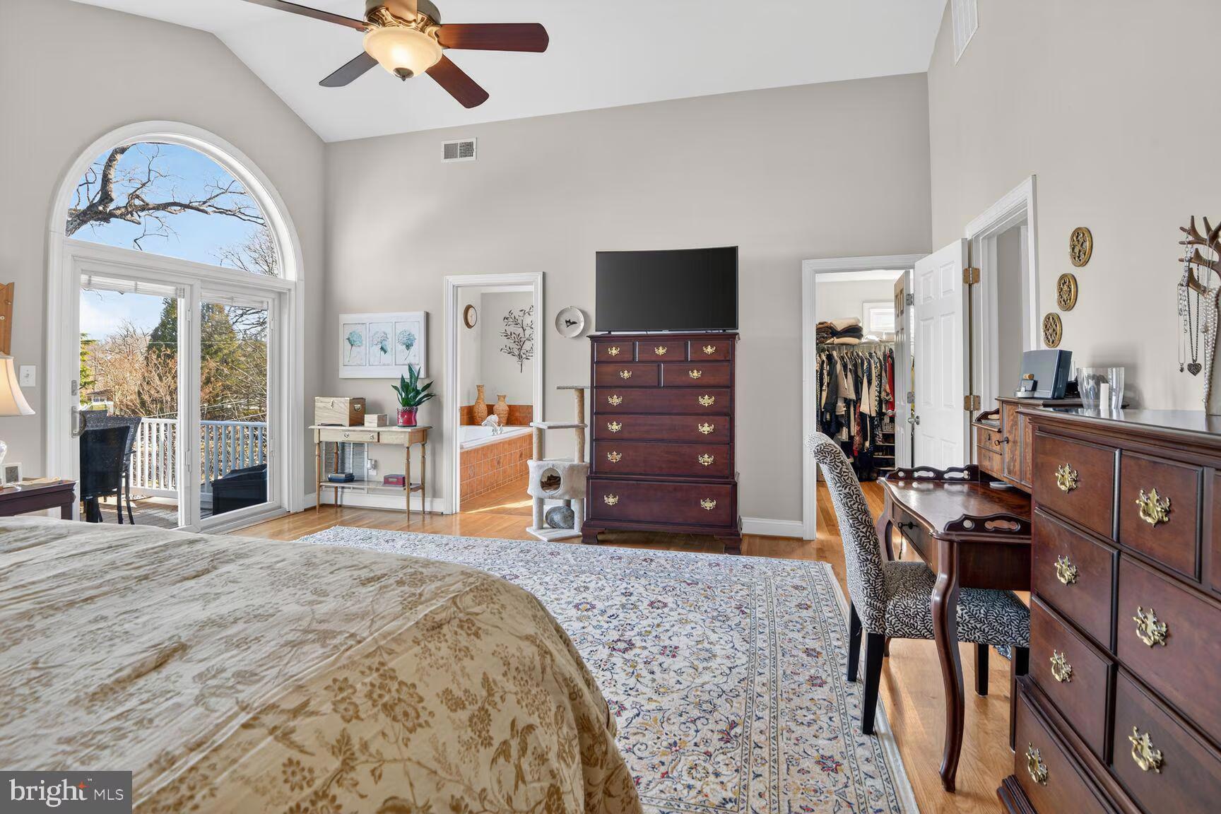Inside, rich white oak hardwood floors span the main level. Dramatic 10 foot ceilings in some areas make the home feel extra spacious and Anderson double hung windows add additional energy efficiency. A formal dining room with bay window sits to the left and is ideal for entertaining. To the right, a custom eat in alcove features rich hardwood built-in bookshelves and booth seating for a cozy gathering space just outside the kitchen. The spacious Gourmet kitchen boasts extra-long granite countertops, Cherry hardwood cabinetry, a five-burner gas stove, double oven, oversized breakfast bar with seating for five, a central vacuum and designer pendant lighting. Open sight lines connect the kitchen to the sun-filled family room, featuring expansive windows, updated double doors that open to the deck, and a stunning wood burning stone fireplace for comfort and warmth all year long. The upper level offers a spacious primary suite with hardwood floors, ceiling fan, large walk-in closet, updated sliding glass doors, private balcony with partial seasonal water views and a BainUltra air jet soaking tub, double vanity, and separate shower. Two additional bedrooms include one with plantation shutters and flexible use as an office, and another with an en-suite bath. An upper-level laundry and refreshment area includes washer/dryer, mini refrigerator, wet bar sink, and cabinetry. The lower-level garage level provides two large open storage areas currently used as a wine cellar.